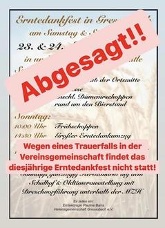 Am Mittwochabend erreichte uns dann eine weitere Hiobsbotschaft. Wegen eines Trauerfalls wird das Erntedankfest in Gresaubach abgesagt!