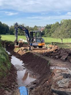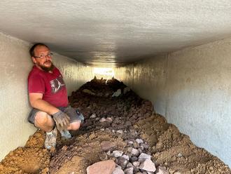 Michael Hell von der Bauunternehmung Backes verteilt händig Gewässerbausteine. Das nach unten für Wasser und Kleinstlebewesen durchlässige Bauwerk sorgt dafür, dass die Fließgeschwindigkeit reduziert wird. Die wieder erlangte Durchgängigkeit für alle Organismen kommt der Qualität und dem Zustand der Fließgewässer zu Gute. Foto: Bernd Kreutzer/VEL