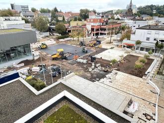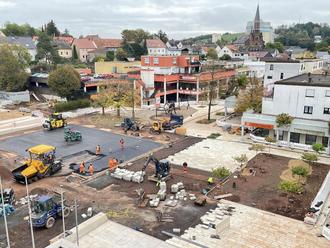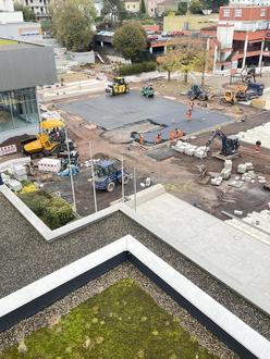 Während auf dem Rathausplatz weiter Stück für Stück die großen, über 100 kg schweren Steine verlegt werden, wurden am Dienstag Vormittag auch eine größere Fläche asphaltiert. Es handelt sich dabei um Vorarbeiten für einen Bereich, auf dem später eine feinkörnige Steinschicht aufgetragen und mit einer Harzschicht am Boden verklebt wird. So entsteht - wie am Eingang der Fußgängerzone von der Marktstraße aus – eine helle, feste Fläche, die sich optisch und funktionell in das Gesamtbild einfügt.