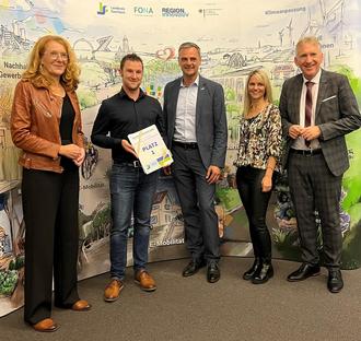 Voller Stolz nahm Marco Schröder stellvertretend für sein Team den Preis, überreicht durch Umweltministerin Petra Berg, Landrat Patrik Lauer und der Vorsitzenden des Kreistagsauschusses Umwelt Claudia Beck im Beisein von Bürgermeister Klauspeter Brill entgegen.