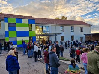 Die Einweihungsfeier an der Grundschule Landsweiler war bestens besucht. Im Hintergrund das sanierte Schulgebäude. Foto: Klauspeter Brill/Stadt Lebach