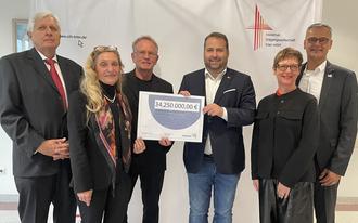 Dr. Rudolf Schmid (Vorsitzender des Aufsichtsrates ctt), Dr. Monika Berg (Geschäftsführung ctt), Dr. Rüdiger Fuchs, (Vorsitzender der Hildegard-Stiftung), Gesundheitsminister Dr. Magnus Jung, Charlotte Kurz (Amtsleiterin Untere Bauaufsicht Saarlouis) und Lebachs Bürgermeister Klauspeter Brill bei der feierlichen Übergabe des Bewilligungsbescheides. Foto: Kirsch/Stadt Lebach