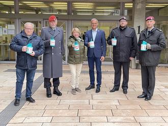 Zum Auftakt der Sammlung war auch Bürgermeister Klauspeter Brill gemeinsam mit Oberst Uwe Staab (Kommandeur Landeskommando Saarland), Major Witzisk von der Luftlandeaufklärungskompanie 260, Hauptmann Macherey von der Fernmeldekompanie Eurocorps, Alwin Theobald (Landesvorsitzender Volksbund Deutsche Kriegsgräberfürsorge) und der Bildungsreferentin Lilian Heinen-Krusche am Markttag in der Lebacher Innenstadt mit blauen Spendendosen unterwegs. „Da ist schon ein bisschen was zusammengekommen“, berichtet der Rathauschef und freut sich, dass er aktiv die Friedensarbeit und Erinnerungskultur des Volksbundes unterstützen konnte. Allen, die in den kommenden Wochen mit den Sammelbüchsen unterwegs sind, wünschte er viel Erfolg und dankte ihnen sowie allen Spenderinnen und Spendern für ihr soziales Engagement.