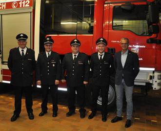 von links: Wehrführer Hans Kartes, Markus Thewes, Jens Breitkopf, Daniel Linnenbach, Bürgermeister Klauspeter Brill. Foto: Wagner