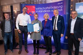 Der Erste Beigeordnete der Stadt Lebach, Markus Schu (2.v.l.), gratulierte Irina Walger, die aus den Händen von Landrat Patrik Lauer (2.v.r.) die Urkunde der Landesbesten erhielt. Foto: Yannick Hoen/Landkreis Saarlouis