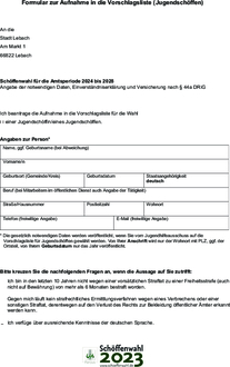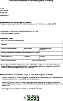 Interessenten für das Schöffenamt in Erwachsenenstrafsachen bewerben sich bis zum 28. Februar 2023 bei der Stadt Lebach, Ortspolizeibehörde, Am Markt 1, 66822 Lebach. Unter www.lebach.de finden Sie das Bewerbungsformular für Schöffen und Jugendschöffen. Ausführliche Infos gibt es unter www.schoeffenwahl.de. Auf Anforderung werden Bewerbungsformulare auch gerne zugesandt oder können im Rathaus persönlich abgeholt werden.