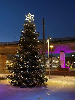 In den frühen Morgenstunden erstrahlt der große Weihnachtsbaum in der neu gestalteten Fußgängerzone am Arno-Schmidt-Kreisel in einem ganz besonderen Licht.