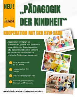 Die Stadt Lebach hat als Träger von Kindertageseinrichtungen ein kooperatives Studienmodell in Zusammenarbeit mit der HTW Saar auf den Weg gebracht. Ziel ist es, Studierenden von ausgewählten pädagogischen und erziehungswissenschaftlichen Studiengängen eine qualifizierte Praxismöglichkeit zu bieten und zugleich neue Wege der Fachkräftegewinnung zu erschließen.
