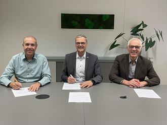 Bei der Unterzeichnung des Konzessionsvertrages: engeris-Geschäftsführer Michael Dewes (li.), Bürgermeister Klauspeter Brill und der Prokurist der energis Wolfgang Martin (re.). Foto: Kirsch/Stadt