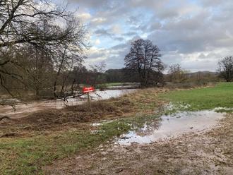 Großflächig überflutete Wiesen bei Hochwasser im Bereich der Illmündung in die Theel.