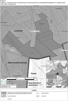 Das Ministerium für Umwelt, Klima, Mobilität, Agrar und Verbraucherschutz - Oberste Naturschutzbehörde - beabsichtigt auf Grund der §§ 20 und 26 des Bundesnaturschutzgesetzes vom 29. Juli 2009 (BGBl I. S. 2542), in Verbindung mit § 20 des Saarländischen Naturschutzgesetzes vom 05. April 2006 (Amtsbl. S. 726), jeweils in der derzeit gültigen Fassung, die Verordnung über die Landschaftsschutzgebiete im Landkreis Saarlouis vom 31. März 1977 (Amtsbl. S. 405), dahingehend zu ändern, dass folgende Flurstücke in der Gemeinde Lebach, Gemarkung Landsweiler, Flur 4, entsprechend der Darstellung der Übersichtskarte, nicht mehr Bestandteil des Landschaftsschutzgebietes L 3.02.20 sind: