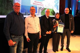 Mitglieder Vorstandes von pro Aqua bekamen symbolisch ein Schwimmbrett von der GeschäftJörg Utech, Karsten Guttke und Michael Möller von der Geschäftsführung überreichten sybolisch ein Schwimmbrett an Peter Tigges und Claudia Schenk vom pro Aqua Vorstand