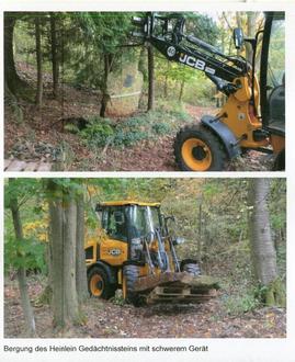 Schon seit einiger Zeit haben sich Mitglieder des Heimatvereins Spangenberg Gedanken um eine Verlegung der Gedenkstätte von Friedrich Heinlein gemacht. Am bisherigen Standort, am Bromsberg, sind immer wieder Bäume umgestürzt und schwere Äste abgebrochen. Ein ungefährdeter Zugang war nicht mehr möglich. Der Magistrat der Stadt Spangenberg hat daher einer Verlegung der Gedenkstätte zugestimmt. Als neuer Standort wurde der Landgraf Philipp Park gewählt, da F. Heinlein in der „Altstadtresidenz“ gewohnt hat und der Park gut zugänglich ist. Im Oktober sind dann weitere Bäume umgestürzt und andere drohten umzufallen. Deshalb wurde Anfang November der Stein durch Mitarbeiter des Bauhofes geborgen und im Bauhof zwischen gelagert.