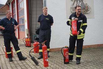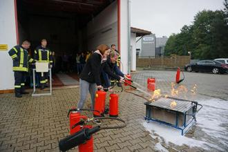 Trotz strömenden Regen nutzten die Mitarbeiter und Mitarbeiterinnen die Gelegenheit, sich mit unterschiedlichen Feuerlöschern vertraut zu machen.