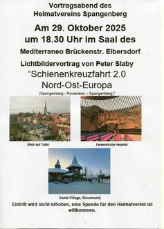 Der erste Lichtbildervortrag wird von Peter Slaby über seine Bahnreise „Schienenkreuzfahrt 2.0 Nord-Ost-Europa (Spangenberg - Rovaniemi - Spangenberg) im Saal der Gaststätte „Mediterraneo“ in Spangenberg-Elbersdorf, Brückenstraße gehalten. Die Veranstaltung beginnt um 18.30 Uhr.
