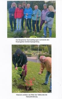 Die Bergheimer Gymnastik-Gruppe nominierte den Rosengarten Schloß Spangenberg e.V. Dieser nahm die Herausforderung an und besorgte flugs eine bienenfreundliche Rose, die dann fristgerecht im Rosengarten, Bereich des Textor-Gartens, gepflanzt und natürlich auch entsprechend begossen wurde. Wie sollte es anders sein – eine bienenfreundliche und reichlich blühende Rose, nämlich die „Ile des Fleurs“. Kommt nächstes Jahr in den Garten und schaut Euch die Blütenpracht an. Gemäß den Regeln nominierte der Rosengarten die Ritter der Tafelrunde. Auch diese nahmen die Herausforderung an und setzten auf dem Eckgrundstück oberhalb des Friedhofes (auf dem die Treffurter Kirschbäumchen stehen) innerhalb der aufgegebenen Frist einen Strauch, der im kommenden Jahr hoffentlich reichlich blüht. Wie es sich gehört, wurde auch dieser Strauch reichlich mit einem geistigen Getränk begossen. Die Ritter nominierten sodann aus der Spangenberger Partnerstadt Cariñena in Spanien die Los Borrachos binnen einer Frist von 10 Tagen ein Bäumchen zu pflanzen.