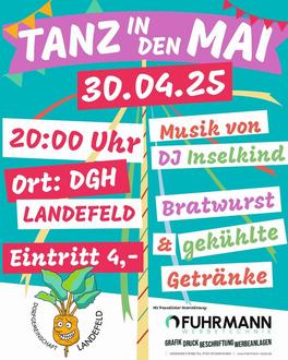 Auch in diesem Jahr lädt die Dorfgemeinschaft Landefeld wieder zum traditionellen, „Tanz in den Mai“ mit DJ Inselkind für die richtige Stimmung ein.
