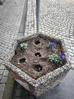 Jedes Jahr beplanzt der Bauhof die Blumenkübel in der Innenstadt mit Frühlingsblumen. Doch leider ist es auch in diesem Jahr wieder vorgekommen, dass die Frühjahrsbepflanzung von unbekannten Personen geklaut wurde.