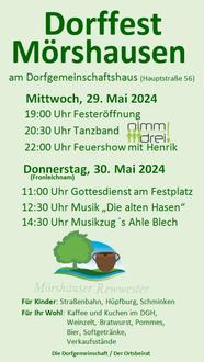 Am Mittwoch den 29. Mai und Donnerstag 30. Mai (Fronleichnam) feiert Mörshausen wieder das beliebte Dorffest. Die Besucher erwartet ein abwechslungsreiches Programm mit tollen Attraktionen für Jung und Alt.