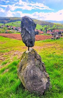 Davíd Jóhannesson aus Selfoss im Süden von Island fasste in seinem Werk „Mother Earth“ Vergangenheit, Gegenwart und Zukunft zusammen – die Erde versorgte uns früher und heute und wir haben ihr dabei zu helfen, dass sie es zukünftig noch kann. David Jóhannessons Werk beschäftigt sich mit der Zerstörung und Wiedergeburt von Landschaft, der Entstehung von Erde, von neuem Land, wie es überall, wo aktive Vulkane sind, geschieht. – Die beiden Steine, bewusst naturbelassen, stammen vom größten Lavafluss auf der Erde seit dem Ende der letzten Eiszeit. Die sehr heiße und flüssige Lava ergoss sich um 6700 v. u. Z. über 140 km aus Islands Hochland zwischen den Flüssen Þjórsá und Hvitá Richtung Südwesten, nur aufgehalten von den eiskalten Wellen des Nordatlantiks, in dem sich bei den heutigen Küstenorten Stokkseyri und Eyrarbakki zahlreiche Schären bildeten, in gewisser Weise geboren wurden. Das große Þjórsárhraun (hraun = Lavafeld, benannt nach dem o.g. Fluss), von dem die Steine kommen, umfasst etwa 975 Quadratkilometer, sein Volumen beträgt 75 Kubikkilometer. Überall, wo Vulkane ausbrechen, Magma an die Erdoberfläche tritt und damit zu Lava wird, entsteht trotz erster Zerstörung neues Land, das Mutter Erde auf diese Weise erschaffen hat. Die Spitze des Kopfsteins zeigt in Richtung Südisland (320 Grad, also 5 Grad über Nordwest), wo die beiden Steine herkommen und David Johannesson ebenfalls einen Stein errichten wollte, dessen Spitze auf Nordhessen gerichtet ist.