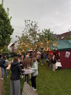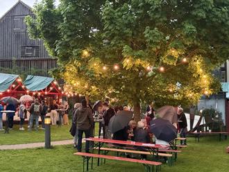 Noch ist es trocken und die ersten Besucher tauschen sich bei einem guten Glas Wein aus
