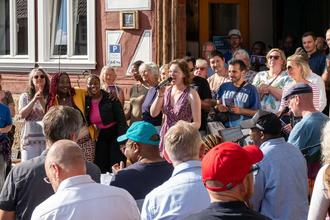 Sängerin Anne Hamburger begleitet die Teilnehmenden des Gospelchor-Workshops während dem Abschlussfest mit einer Soloeinlage zu dem Lied "Get out of the boat" von Joakim Arenius.
