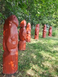 Peter Hecht hat hier fünf Tiere, die in unserer Gegend heimisch waren, aber ausgestorben sind, sowie eine Eule in kompakt blockhafter Darstellungsweise geschaffen. „Bezugspunkt der Arbeiten ist die prähistorische Tierdarstellung verschiedener Kulturen, in denen eine tiefe Achtung vor der Natur sichtbar wird,“ sagt der Künstler über seine Werke. Hier hat er sich an einer indianischen Gestaltungsweise orientiert, bei der die Tierwesen wie Baumstämme aufrechtstehend ihren Blick gen Himmel richten. Die weise Eule, Mittlerin zwischen Vergangenheit und Gegenwart, die die Wanderer mit ihrem typisch weit gedrehten Kopf (möglich wird diese Beweglichkeit durch 14 Halswirbel, alle anderen Wirbeltiere haben nur 7) eindringlich fixiert, erzählt vom Untergang dieser fünf Arten. Lange Zeit war der Elch, die größte Hirschart, in ganz Europa heimisch. Durch Bejagung und Lebensraumverlust wurde der Elch bei uns im 20. Jahrhundert ausgerottet. Dank strenger Schutzvorschriften und Jagdverbote kehrt er vor allem aus Polen und Tschechien ganz, ganz allmählich nach Deutschland zurück. – Das Auerhuhn bewohnt lichte Bergwälder und besiedelte in Deutschland früher einen breiten Waldgürtel vom Spessart bis zum Thüringer Wald. In Deutschland gibt es nur noch einzelne Vorkommen im Schwarzwald, Bayerischen Wald, im Fichtelgebirge, im Hochsauerland und am Nordalpenrand. Das Auerhuhn lebt fern vom Menschen in alten Nadelwäldern in Bergregionen. Eine ausgeprägte Bodenvegetation sowie Ameisennester und Heidelbeeren sind oft Bedingungen für das Vorkommen des Auerhuhns. Durch intensive Forstwirtschaft, die eine Störung der natürlichen Waldvegetation bedeutet, ist das Auerhuhn hier schon längst ausgestorben und allgemein in Deutschland vom Aussterben bedroht. – Schrumpfende Lebensräume und Jagd führten ab dem 11. Jahrhundert zum Rückgang der Wisent-Populationen in Europa. Vor hundert Jahren waren die imposanten europäischen Bisons beinah ausgestorben. In Brandenburg wurden ab 2010 Wisente in der Döberitzer Heide ausgewildert; inzwischen umfasst die Herde rund 130 Tiere. Das 1860 Hektar große Gebiet liegt auf einem ehemaligen Truppenübungsplatz, auf dem auch zahlreiche Wildpferde und ein Wolfsrudel leben. Im Jahre 2013 wurde im Rothaargebirge eine achtköpfige Wisentherde ausgewildert. Damit leben nun erstmals seit einem halben Jahrtausend wieder eine kleine Zahl Wisente frei auf dem Gebiet des heutigen Deutschlands. Wölfe haben sich hier zaghaft wieder angesiedelt. Für das Monitoringjahr 2023/2024 geht der DBV von 1.800 bis 3.300 Tieren in Deutschland aus. Wölfe wurden in ganz Europa gejagt und verfolgt und starben in den meisten Teilen Westeuropas aus, wobei sie sich in Ländern wie Italien, Polen und Bulgarien hielten. Obwohl der Wolf in vielen Menschen hierzulande eine Urangst weckt, ist das Wildschwein das gefährlichere Tier im Wald. Das ist um Gottes Willen aber kein Grund, es auch auszurotten! Denn Waldtiere werden zugunsten lukrativer Waldwirtschaft zurzeit unverhältnismäßig stark bis kurz vor der Ausrottung dezimiert, so dass sich Jäger bereits große Sorgen um die genetische Vielfalt u.a. des Rotwildes machen (HNA Hef.-Rof. 24. Juli 2024). Gäbe es noch genügend Wild im Wald, müssten sich auch Schafszüchter nicht vor Wolfsangriffen sorgen und nach Wiederabschusserlaubnis der wenigen Wölfe in unserer Gegend rufen. – Vor fast 200 Jahren – genauer im Jahr 1835 – wurde der letzte in Deutschland heimische Bär in der Nähe vom bayerischen Ruhpolding erlegt. Der europäische Braunbär war damit deutschlandweit ausgerottet. In Deutschland gibt es auch heute keine freilebenden Braunbären mehr.