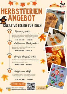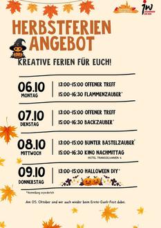 Der Mittwoch, 8. Oktober, bietet zwei Highlights: Zunächst können die 8- bis 12-Jährigen von 13:00 bis 15:00 Uhr beim „Bunter Bastelzauber“ kreativ werden. Hierbei gestalten sie aus Fimo, Window Color und weiteren Materialien bunte Kürbisbilder für das Fenster. Die Kosten belaufen sich auf 8€. Im Anschluss, von 15:00 bis 16:30 Uhr, lädt die Jugendförderung zu einem „Kino Nachmittag“ ein.