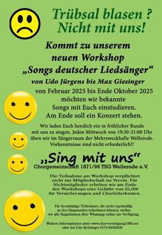 Wer Lust hat an unserem Chorprojekt „Songs deutscher Liedsänger“ teilzunehmen, der sollte sich bis spätestens Ostern unserem Chor anschliessen. Vor allem mangelt es an männlichen Sängern. Habt Mut, wir freuen uns auf eure Unterstützung.