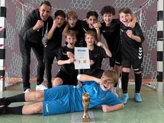 Auf dem Foto sind zu sehen: (Oben) Lehrer Matthias Fichtner, Mudasir, Pascal, Tarek, Demid, Lorenzo, (Mitte) Pascal und Elia, (Unten) Torwart Cem