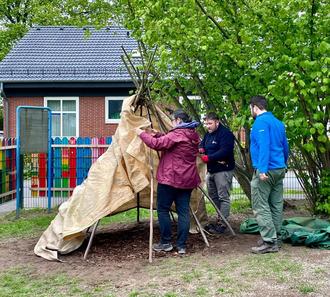 Eine Wildblumenwiese wurde angelegt und anschließend mit Mulch versiegelt. Des Weiteren wurde das Bohnentippi erneuert und neue Schilder angebracht sowie eine neue Balanciermöglichkeit erschaffen, die von den Kindern schon sehr gut angenommen wurde.