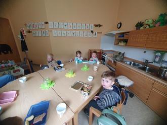 Treffpunkt war an diesem Tag in der Kita "Kleine Wichte". Die Krippenkinder frühstückten gemeinsam in der Kita "Kleine Wichte", bevor sie ihren Patenzahnarzt, Dr. Löber, aufsuchten.