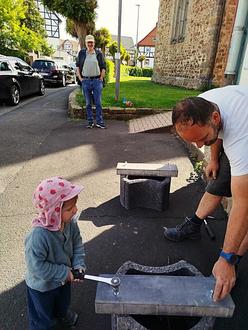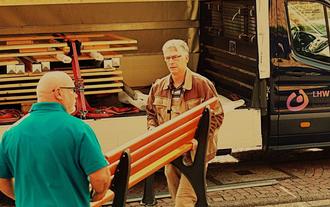 Die beiden neuen wurden am Dienstag letzter Woche angeliefert. Gebaut und geliefert von der Lebenshilfe Marburg, einer Werkstatt für Menschen mit Beeinträchtigungen. Gestiftet wurden sie von Markus Pfaff, der auf unsere Anfrage sofort positiv reagierte und die Kosten übernehmen wollte. Fürs Aufstellen der Bänke hatte aber weder seine Firma noch die Lebenshilfe Zeit. Wie toll, dass Janko Moser sofort zusagte, dass er das übernehmen würde. Denn natürlich hätten wir Frauen vom Serviceteam des Mittagstischs das allein niemals hingekriegt. Das Einbetonieren und Verschrauben erforderte nicht nur Muskelkraft sondern auch Fachkunde. Dazu konnten wir nur eine klitzekleine Hilfe beisteuern. Die Einladung zum Mittagessen konnte die verbrauchten Kalorien kaum ersetzen.