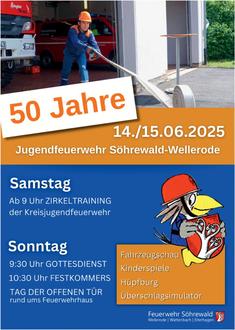 die Jugendfeuerwehr Söhrewald Wellerode hat allen Grund zu feiern. Darum laden wir alle Bürgerinnen und Bürger, alle Firmen mit ihren Angestellten und auch alle Vereine ganz herzlich zu einem großen Festtag ein, den wir mit einem Gottesdienst auf dem Hof der Feuerwehr um 9.30 Uhr beginnen. Anschließend folgt der Festkommers, wo ihr die besten Geschichten aus den letzten 50 Jahren hört und euch ein Bild von der vielfältigen Jugendarbeit in der Feuerwehr machen könnt. Nach dem Festkommers geht es über, in einen bunten Tag, mit tollen Attraktionen, wie z.B. einem Überschlagsimulator, einer Schauübung unserer Nachwuchs Brandschützer und vieles vieles mehr.