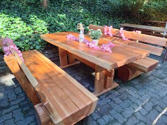 Die Einweihung fand bei schönem Wetter, aber leider nur 10 Mitgliedern statt, so das wir sie gleich ausprobieren konnten. Es gab Bratwurst, Steaks und Bauchfleisch vom Grill. Die Sitzgruppe ist aus massiver Douglasie gefertigt und wird die Besucher des Naturfreundehauses viele Jahre erfreuen.