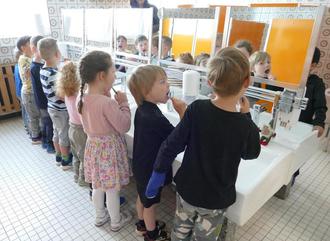 Die Kinder der „Gelben Wichte“-Gruppe üben fleißig, ihre Zähne nach der „KAIplus“-Methode zu putzen.
