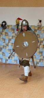 Nach einem Tänzchen zur Einstimmung zu mittelalterlicher Musik zeigte uns Volkmar mit seinem reichhaltigen Schatz an Kleidung, Waffen und Gegenständen wie ein einfacher Mann von damals zu einem Edelmann oder gar zum Ritter wurde und woran man diese unterscheiden konnte.