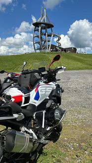 Weiter ging es über die Bundesstraße 458 vorbei an Dipperz wobei spätestens hier schon die Nähe zu Bayern feststellbar war. Grüne Täler mit einsamen Höfen, langgezogene Kurven durch grüne Weiden mit Rindern und kurvenreiche Abschnitte durch kleine Wälder. Weiter ging es durch Dietges, durch Batten, Seiferts, Frankenhein/Rhön in Thüringen. Diese Gemeinde zählte viele Generationen zu den ärmsten Gemeinden in der Rhön die sich überwiegend mit der Herstellung von Bürsten und Peitschen und Artikel aus Holz bescheidene Einkünfte erwarben. Von dort ist es nicht mehr weit bis zu Noahs Segel, einer bekannten Ausflugsplattform und eines der Highlights des UNESCO Biosphärenreservats Rhön. Die supertolle Rutsche über 3 Stockwerke wurde von keinem der Teilnehmer genutzt, da die Motorradbekleidung eine Bremswirkung verursacht.