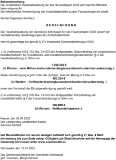 Die Haushaltssatzung der Gemeinde Söhrewald für das Haushaltsjahr 2025 bedarf der