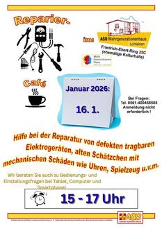 Anbei ein Flyer für das Reparier-Café im ASB-Mehrgenerationenhaus Lohfelden mit der Bitte um Veröffentlichung in ihrem Gemeindeblättchen KW 3.