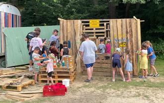 Und dieses Motto setzten die Betreuer kreativ um. Endlich wurde wieder eine richtige Hütte gebaut und angemalt! Die soll, so der Plan, zum Abschlussfest den Bratwurstverkauf beherbergen.