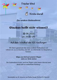 | 19:30 Uhr | im Pfarrsaal von St. Heinrich, Niester Str. 16, Oberkaufungen |