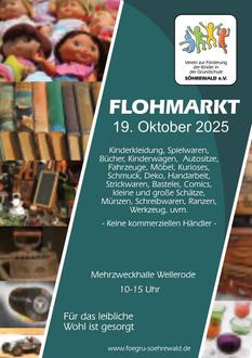 Am Sonntag, den 19.10.2025, veranstaltet der Verein zur Förderung der Kinder in der Grundschule Söhrewald e.V. von 10-15 Uhr einen Flohmarkt in der Mehrzweckhalle Wellerode. Der Erlös kommt gemäß unserer Satzung den Kindern der Grundschule Söhrewald zu Gute. Für das leibliche Wohl ist gesorgt!
