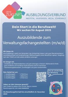 Wir suchen zum August 2025 zwei Auszubildende zum Verwaltungsfachangestellten (m/w/d).