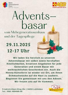 Das ASB-Mehrgenerationenhaus und die ASB-Tagespflege an der Lange Straße 25c in Lohfelden laden für Samstag, 29. November, von 12 bis 17 Uhr zu einem Adventsbasar ein. Freuen Sie sich auf süße und herzhafte Leckereien, kreative Angebote sowie einen Basar mit liebevoll gestalteten weihnachtlichen Geschenken. Eine Henna-Künstlerin wird ebenfalls vor Ort sein, um den Besucherinnen und Besuchern Schmuckstücke auf die Haut zu zaubern.