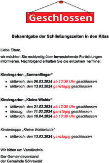 Mittwoch, den 06.03.2024 ab 13:30 Uhr geschlossen