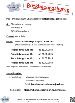Das Familienzentrum Staufenberg freut sich in Zusammenarbeit mit Jasmin Lorenc, Hebamme, weitere Rückbildungskurse in der Pfarrscheune Uschlag, Mühlenstr. 6 anbieten zu können.