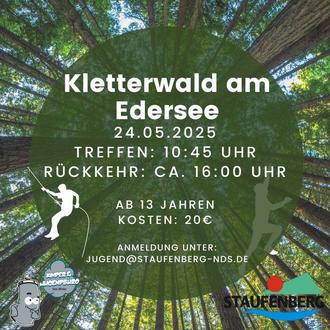 Am 24.05.2025 fahren wir in den Kletterwald am Edersee! Hier könnt ihr euch drei Stunden im Kletterwald austoben! Anmeldung und Einverständniserklärung findet ihr auf der Gemeindewebsite unter dem Reiter Kinder- und Jugendbüro / Aktuelles.