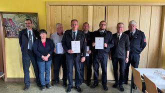 v.l.n.r Ortsbrandmeister Markus Mogge, Ortsbürgermeisterin Heike Spohr, Uwe Gorbandt, Sven Kühne, Jan Heinze, Jens Hentschel, Gemeindebürgermeister Bernd Grebenstein und stellv. Gemeindebrandmeister Gerold Vogeley