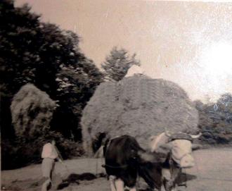 Die Heuernte war stets eine schweißtreibende Arbeit. Die Sonne und hohe Temperaturen war hier sehr wichtig. Ich habe es nicht mehr erlebt, dass die Wiesen nur mit der Sense gemäht wurden. In den dreißiger Jahren hatten die Bauern mit Pferden bereits eine Mähmaschine. Nur vereinzelte Kuhbauern hatten eine solche. Das Ziehen der Maschine benötigte viel Kraft für die Kühe. Natürlich wollten auch die kleinen Landwirte eine Mähmaschine. Auch wir hatten mit dem Schwager meines Vaters gemeinsam eine Krupp Mähmaschine gekauft. Da wir Wiesen mit Hanglage hatten, konnten die Kühe die Maschine bergauf nicht ziehen. Wir fuhren die Mähmaschine mit den Kühen ohne zu mähen wieder bis oben zum Anfang der Wiese für den nächsten Schnitt bergab. Wenn der Mähbalken verstopft war, musste die Maschine rückwärts von uns geschoben werden um den Mähbalken zu säubern. Die Kühe konnten die Maschine nicht nach hinten schieben, es war Menschenkraft notwendig. Bei den Pferdegespannen war das kein Problem. Nach einem Jahr wurde diese Plagerei mit den Kühen nicht mehr vorgenommen. Mein Vater bestellte einen Bauer mit Pferden und zahlte dafür. Als Kind musste ich immer bei diesen Mähen mit Pferden dabei sein, mit einem Rechen in der Hand hinter der Maschine hergehen und das vereinzelt liegende Gras auf der Freifläche zurück zum gemähten Schwad mit dem Rechen freimachen. Wenn der Bauer Karl Schäfer für uns gemäht hatte, sagte er, „komm ich setzte dich aufs Pferd“. Es war ja gut gemeint, aber mit kurzer Hose und dann auf den Rücken vom Pferde mit dem Geschirr, das war für mich nicht angenehm, ja es war schmerzhaft. Zu Beginn musste das gemähte mit dem Rechen gestreut werden. Dann musste das Gras öfters gewendet werden. Je mehr Sonne und Hitze, desto schneller wurden die Gräser trocken. Es dauerte einige Tage. Dann kam der Großvater mit den Leiterwagen und den Kühen zur Abfuhr vom Heu nachhause. Meine Mutter auf dem Wagen zum Laden und hier war besondere Erfahrung erforderlich. Mein Vater gabelte das Heu auf den Wagen. Wir mussten das liegen gebliebene Gras, wir sagten, nach rechen, weiter auf das noch liegende Heu schieben. Dann wurde ein Heubaum auf den Wagen gelegt und mit Ketten angespannt, damit das ganze wie ein Paket zusammen gehalten wurde.